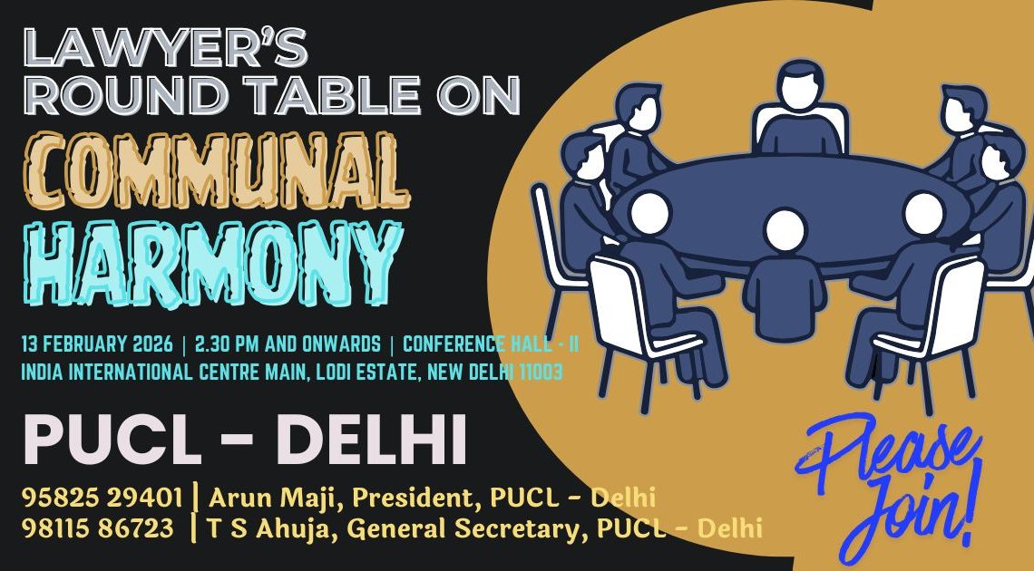 This Lawyer’s Round Table proposes to discuss the issues related to hate crimes and hate speeches and explore the possibilities of addressing the same through collective efforts under the aegis of Delhi Unit of the People’s Union for Civil Liberties. For evolving a consensus on the methodology for effective action, PUCL-Delhi is organising this Lawyer’s Round Table on 13th February 2026 from 2.30 pm to 6 pm at Conference Hall II, India International Centre, Max Muller Road, Near Khan Market, New Delhi-110003.